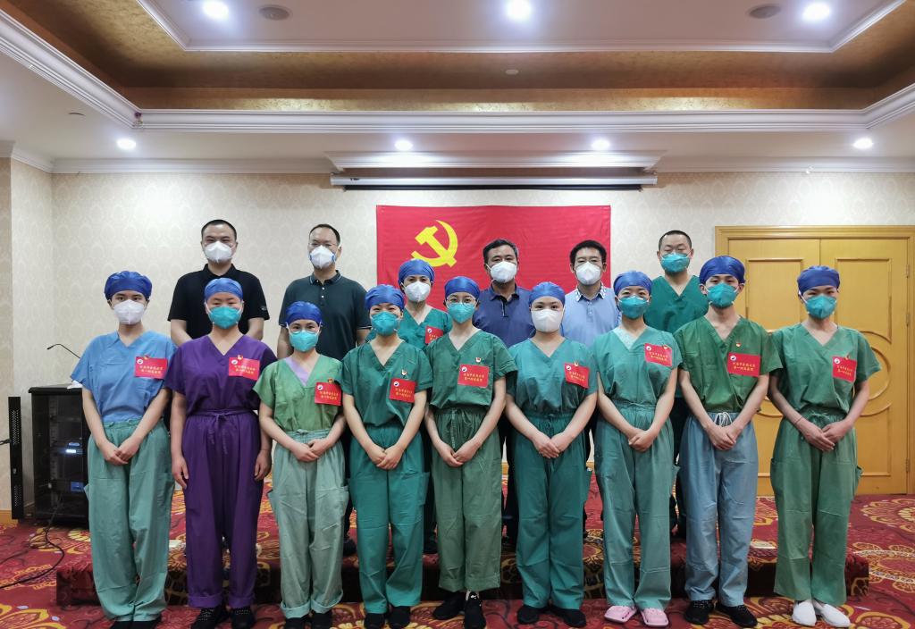 本网讯(文图/王丹)2022年5月23日下午,爱体育(中国)第一附属医院援沪医疗队在驻地为新发展的9名党员举行入党宣誓仪式,河南省援沪医疗队临时党委书记、总领队周勇,党委副书记、副总领队董薇,河南省卫健委中医处副处长段瑞昌等指挥部领导参加仪式。