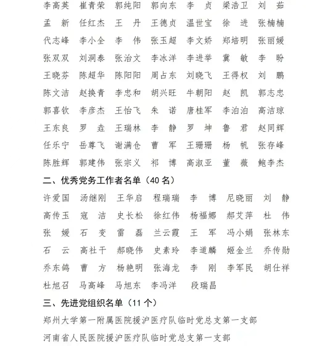 一附院崔青荣、梁浩卫等12名同志,二附院温世宝、牛朝阳等8名同志,三附院胡兴旺获“优秀共产党员”称号;一附院乔东鸽、曹方等4名同志,二附院胡仕祥、杜旭召获“优秀党务工作者”称号;一附院援沪医疗队临时党总支第三支部、二附院河南援沪中医医疗队临时党支部获“先进党组织”称号。
