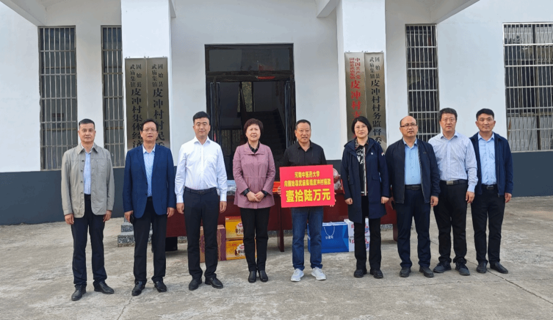 李小芳表示学校定点帮扶皮冲村十年来,在强化组织建设、推动产业发展、改善人居环境、弘扬文明新风、健康医疗帮扶等方面开展了大量工作,有力助推了脱贫攻坚和乡村振兴,取得了看得见、摸得着的扎实成效,学校将进一步发挥在乡村振兴中的特色优势,坚持物质文明、精神文明两手抓,努力让中医药诊疗技术和中医药文化真正走入“寻常百姓家”。调研期间,李小芳一行与村“两委”在皮冲村村部举行爱心捐赠仪式,代表学校向固始县武庙集镇皮冲村捐赠乡村振兴建设资金十六万元、爱心美德超市运转资金以及办公用品等。